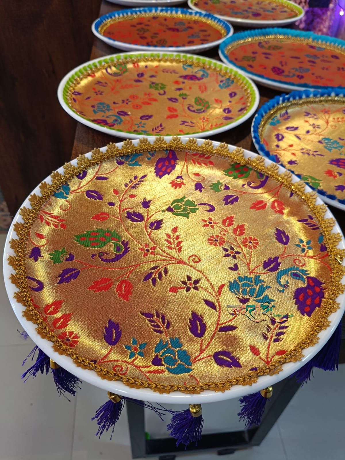 Add a royal touch to your offerings with handcrafted Paithani trays, perfect for festive serving.
